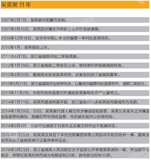2007年2月7日,吴英在北京机场被来自浙江省东阳市的公安人员带走,同年因涉嫌非法吸收公众存款罪被逮捕,两次被以集资诈骗罪判处死刑。最高法未核准死刑,于2012年5月21日,改判吴英死刑(缓期二年执行)。2014年7月,浙江省高院作出裁定,将死缓减为无期徒刑。