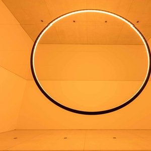 专为本次北京个展而新创作的作品“道隐无名”,看起来更抽象而诗意。站在展厅门口,你会以为里面有一只悬吊在半空中的巨型灯环,散发着诱人的黄色光芒,可是进入其中就会发现,那只是个半环,剩下的半圆型只是镜面反射。目光随着圆环游移到屋顶边缘,你才意识到,其实整个房间都被一面大镜子覆盖着。
