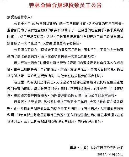 网上一份流传的致员工公告,公告称这次是监管部门的一次严格检查,为期三到五天,并让工作人员做好安抚投资者的工作。