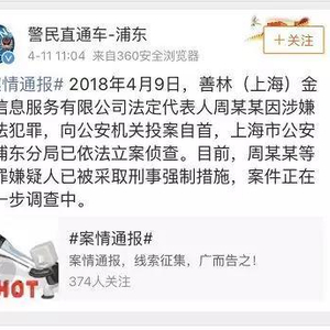不过一切猜测在昨日上午尘埃落定。11点,上海市公安局浦东分局官方微博通报案情,“2018年4月9日,善林(上海)金融信息服务有限公司法定代表人周某某因涉嫌违法犯罪,向公安机关投案自首,上海市公安局浦东分局已依法立案侦查。目前,周某某等犯罪嫌疑人已被采取刑事强制措施,案件正在进一步调查中。”
