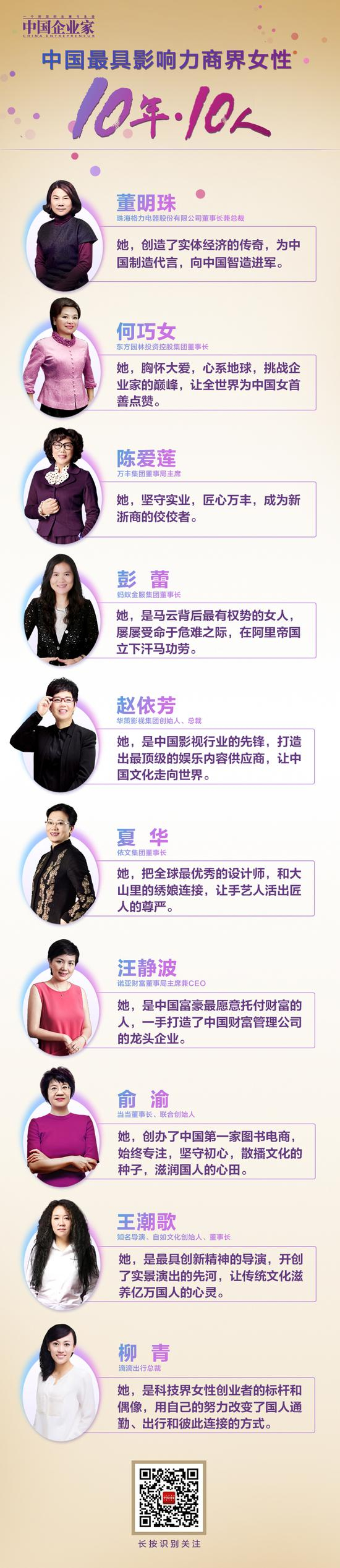 谁是中国最具影响力的女企业家?董明珠自然当仁不让。如果选10个,谁能和董明珠并肩?