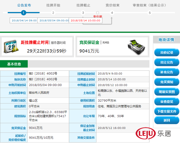 烟J〔2018〕4003号,县府街以南、奇泉路以西A地块,出让面积21177.6平方米,容积率1.4≤R≤1.8,规划用途住宅、商服及公共管理与公共服务,出让起始总价2762万元,起始楼面价725元/平。