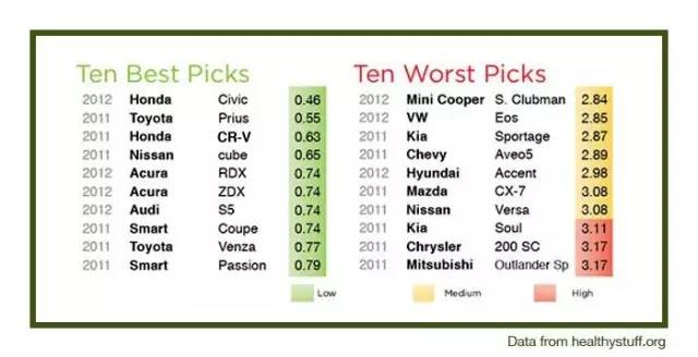 再来看看这份国外研究结构排出的车内TVOC污染排行表,调查涉及的品牌并不全,涉及共204款车型,2011-2012的新车。污染最轻的车型是本田的思域,为0.46mg/m³,三菱劲炫表现最差,为3.17mg/m³。
