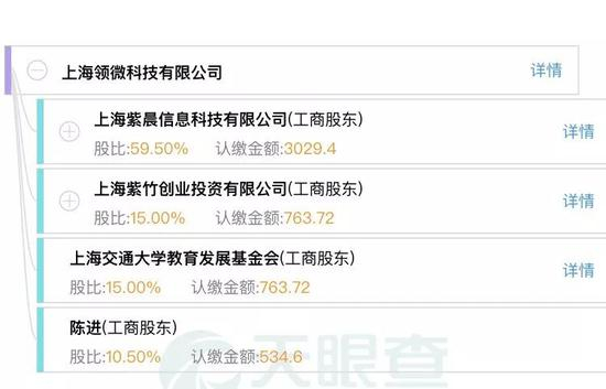 截至目前,天眼查信息显示陈进仍然为上海领微的唯一一名自然人股东,持股比例为10.5%,该公司大股东为上海紫晨信息科技有限公司。持股59.5%;上海紫竹创业投资有限公司和上海交通大学教育发展基金会各持股15%。