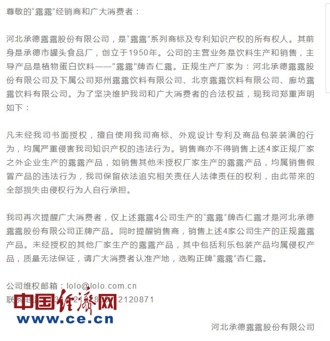 露露公司在声明中指出,河北承德露露股份有限公司,是“露露”系列商标及专利知识产权的所有权人。其前身是承德市罐头食品厂,创立于1950年。公司的主营业务是饮料生产和销售,主导产品是植物蛋白饮料——“露露”牌杏仁露。