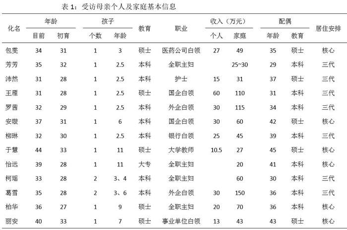 此外,笔者还收集了受访人配偶的相关信息。表1展示了所有受访人及配偶的基本信息(受访人姓名均为化名)。13位受访母亲,年龄分布在31-44岁之间,除3位全职妈妈无个人收入外,其他受访人的个人年收入在10.5-60万元之间,加上配偶收入后家庭税后年收入20万元以上。所有受访母亲的初育年龄均小于35岁。