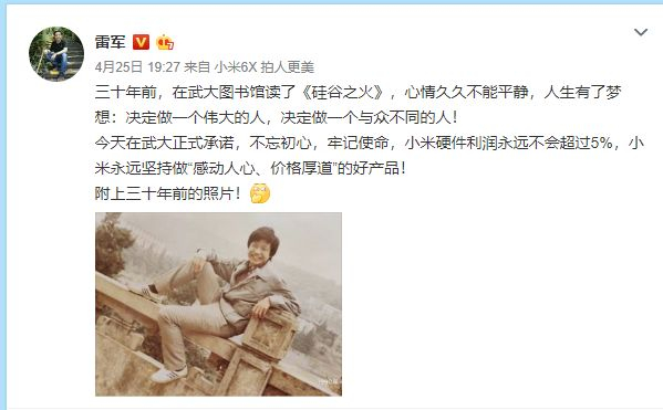 4月25日,雷军回母校武大发布小米6X ,小米6X在武汉大学发布,小米科技还与武汉大学共建AI联合实验室,小米对这个实验室注入了1000万元的研发经费。