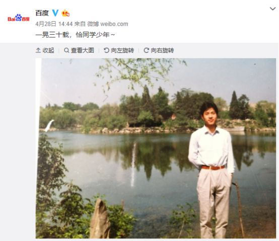与此同时,百度微博晒出的李彦宏学生时代照片,并配字“一晃三十载,恰同学少年”: