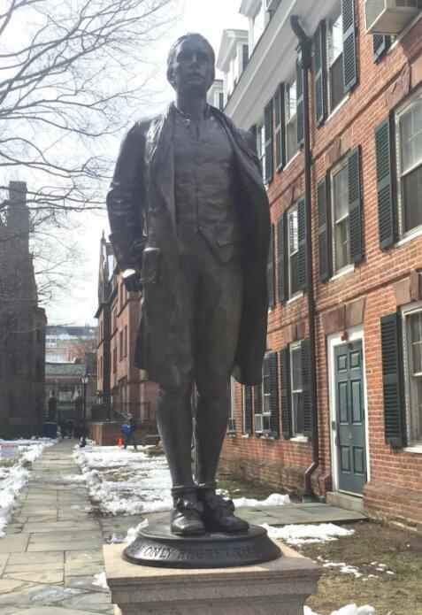 关于黑尔,我年轻时就从英文课本中熟知了他的事迹。在他曾经住过的校舍旁,耶鲁为他塑了一尊全身铜像。这是个英俊的年轻人,脸庞瘦削,英气逼人。不过一夫指着铜像告诉我,这并非黑尔的“本来面目”。原来,他去世的时候并没有留下照片和遗像,因此学校无从知道他的模样。后来要建造一尊铜像纪念他,于是学校就召集当时所有的在校男生到草坪上,从中挑出一位最为英俊潇洒的学生,把他作为黑尔雕塑的蓝本,这才有了现在我们看到的雕塑。在所有的耶鲁人看来,黑尔本身就是最完美最英俊的耶鲁人。
