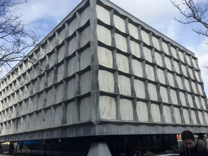该图书馆造型特别,外墙全部由薄薄的大理石板搭建而成,没有窗户。这些半透明的石板可以挡住太阳的紫外线,让里面的古籍善本不至于受阳光的照射,而又不至于里面漆黑一团。进到里面,看到那些历经数百年而犹在的图书珍品一排排陈列在书架上,我也颇感震撼。