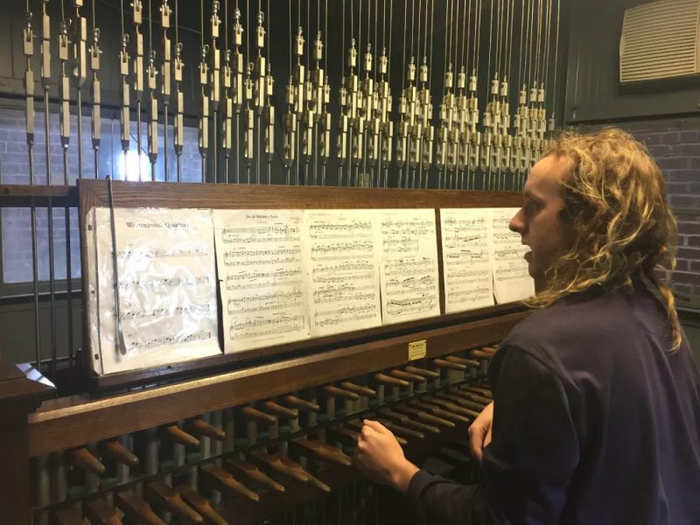 这位学生先在管风琴上演奏了叮当作响的报时钟声后,就开始演奏起优美的乐曲来。他接二连三地演奏各种曲目,手脚并用,忘情地演奏,陶醉其中,54口钟琴把悠扬的音乐送到校园的四面八方,也把我带入一个美妙的音乐世界。