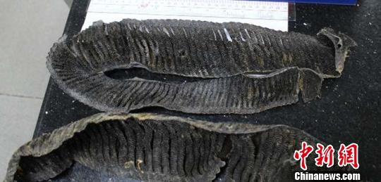 海关关员介绍说,此次查获的物品为蝠鲼的鳃,是蝠鲼游动时用于过滤海水里的浮游生物的器官,共3片,重0.35公斤,呈扁条形,长度均在30cm以上,宽度均在5cm以上,属蝠鲼鳃中较大者。