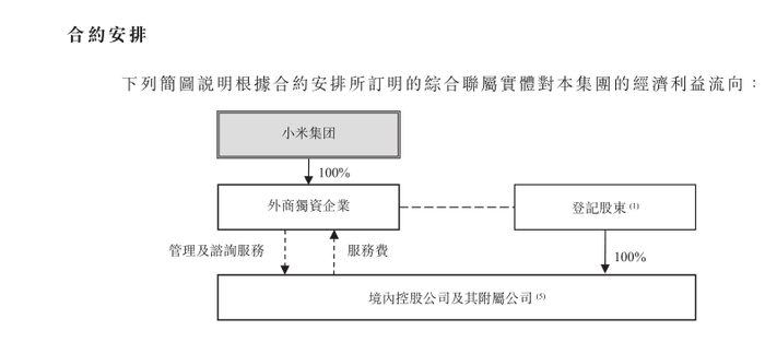 小米集团设立了独资控股的外商投资企业。而实际开展小米经营活动的境内控股公司及其附属公司则由所谓的“登记股东”持股。登记股东并非前述外商投资企业,而是由雷军及联合创始人出资的北京瓦力文化、美卓软件设计、小米科技、北京多看、北京瓦力网络、小米影业、北京小米电子软件等公司构成。