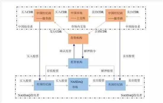 CDR的交易过程可以借鉴ADR(美国存托凭证),境外上市公司如果在美国股市发行ADR,基本交易过程为当地经纪商买卖股票——当地托管人——美国存托人——美国经纪商发行存托凭证ADR——买卖给美国投资者。这样就实现了独立市场之间的互通。