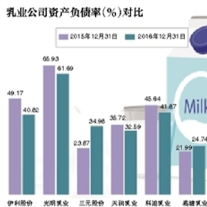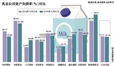 记者注意到,2015年和2016年,新希望乳业的资产负债率与同行业其他公司相比为最高,分别达到当年同业可比公司均值的1.6倍和1.8倍。