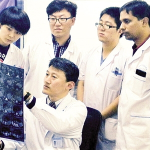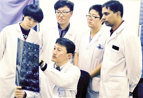 尚东(坐者)和同事们研究患者病情。 资料图片