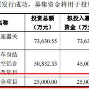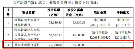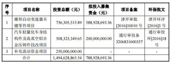 根据文灿股份2017年12月披露的招股书申报稿,公司拟用7.36亿元、4.5亿元、2.5亿元募投资金,投向雄邦自动变速器关键零件项目、汽车轻量化车身结构件及高真空铝合金压铸件技改项目和补充流动资金。