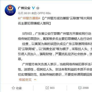 广东省广州市公安局通报称,5月8日,广东省公安厅部署广州警方开展收网行动,成功摧毁“云联惠”特大网络传销犯罪团伙,黄某等多名主要犯罪嫌疑人在行动中落网。