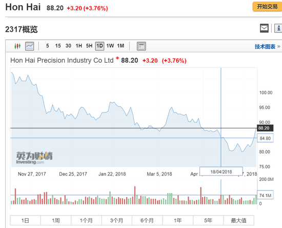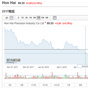 今日早间,鸿海集团在台股价一度涨6.4%,为6月26日以来最大涨幅。现涨3.76%,报价88.2台币。