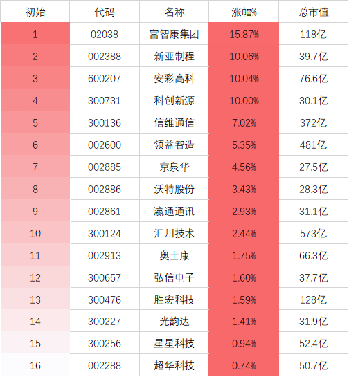 富士康板块表现亮丽,安彩高科、新亚制程、科创新源涨停,信维通信涨超7%,领益制造涨超5%,京泉华、沃特股份等涨超3%。港股富智康更是飙涨15.87%