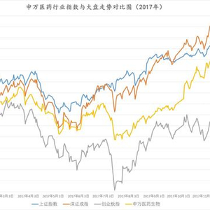 国家战略层面的重视反映在资本市场上,则是医药生物板块在一级和二级市场所占据的重要地位,以及近年来行情的快速崛起。以行业指数的表现衡量,2017年申万医药生物行业累计上涨3.85%,弱于上证指数的6.56%和深证成指的8.48%,但远超倒跌10.67%的创业板,见下图: