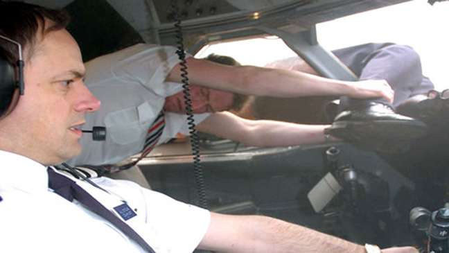 《空中浩劫》纪录片画面显示,英航空乘拽住机长的脚,副驾驶执飞。