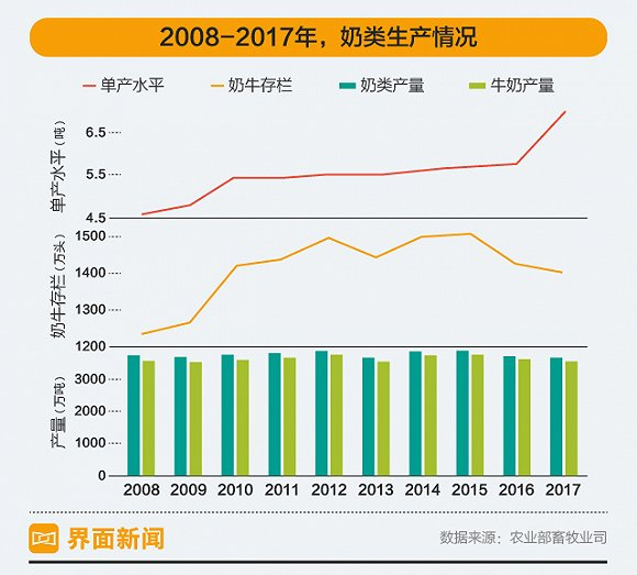 中国的奶牛规模化养殖程度一直不高,2008年100头以上的规模养殖比例只有19.5%,散户在自家后院养牛,游走村庄的奶站收奶员向散户收奶,再交给乳制品公司作为原料,整个过程缺乏有效完善的质量监控,也给了10年前在三鹿收购原奶过程中添加三聚氰胺的机会。