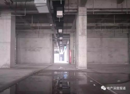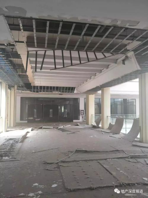 绕道往内,残颓更甚。柳絮、枯叶、垃圾、玻璃渣、灰尘布在地面、电梯等随处可见的地方,脚底走过时灰尘会记录下你的印迹。走廊上大片石膏吊顶砸下,钢筋裸露悬挂在半空,乳胶漆大范围地脱落,导致天花板、墙壁斑驳狼藉,从中穿过,偶有水滴、腻子粉落在发间,满目疮痍好似刚被台风洗礼过的现场。原定的商铺区仍为毛坯,地面上一滩滩积水让人几乎无从下脚。