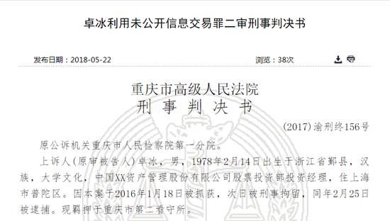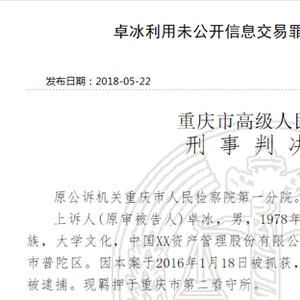 新浪财经讯 5月22日消息 据中国裁判文书网22日公布消息,中国人保资产管理股份有限公司投资经理卓冰因涉嫌“老鼠仓”交易被重庆市高级人民法院判处两年徒刑,并处以罚金200万元。