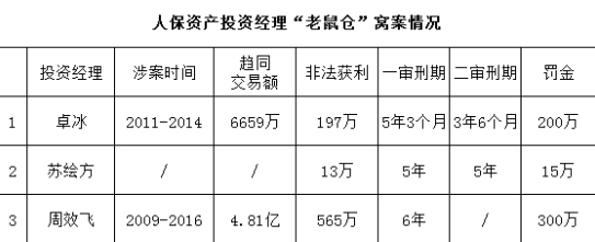 另外,此前已公布的两起“老鼠仓”案件中,人保资产投资经理苏绘方非法获利13万元,被判处有期徒刑五年,并处罚金人民币15万元;周效飞趋同交易4.8亿元非法获利565万元,被判处有期徒刑6年,并处罚金人民币300万元。