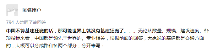 在中国社交网站知乎热榜上题为“为什么说中国是基建狂魔”的问答中,超过800个网友进行了回答,对中国基建实力的感叹和自豪溢于言表。