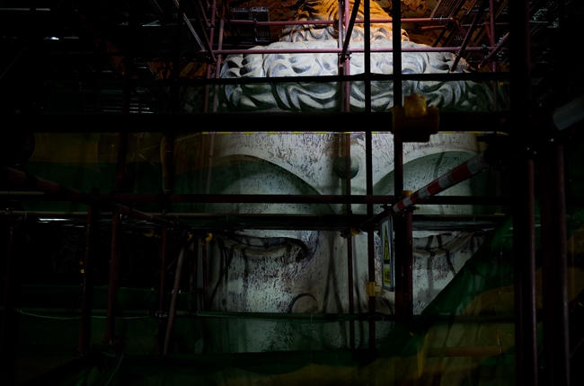 “多少年来我们的工作不断地规范化、科学化,比如这个脚手架,看起来很基础,但是与建筑工程用的那种有明显差异,要适合文物修复工作。”于宗仁说,早期的脚手架就是用木头搭起来的、需要借助手电打光,后来随着国际合作的推进,细节都越来越精细、严格。安全防护标识、层位标识、电源、台阶、防火装置等的配置都比较齐全。