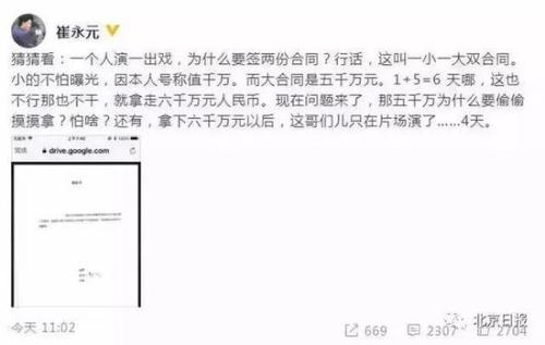 在后续采访中,崔永元更是毫不讳言自己还有一抽屉这样的合同,“随便拿出来一个当事人都得进去,不光范冰冰,牵扯到的全是大腕儿!”