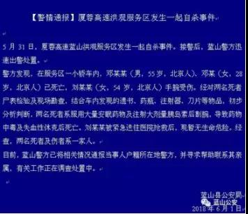 今天(6月2日),湖南省永州市蓝山县公安发布一则警情通报称,5月31日,在厦蓉高速蓝山洪观服务区发生一起自杀事件,三位自杀者系一家人,其中两人死亡,一人经抢救暂无生命危险。