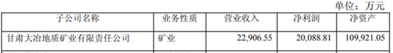 2015年3月,刚泰控股董事会通过了甘肃刚泰控股(集团)股份有限公司关于全资子公司甘肃大冶地质矿业有限责任公司收购国鼎黄金有限公司 100%股权,根据相关公告显示:经众华会计师事务所(特殊普通合伙)审计,并出具了标准无保留意见的《国鼎黄金有限公司 2014 年度财务报表及审计报告》。经审计,截止 2014 年 12 月 31 日,国鼎黄金总资产为 7.23亿元,总负债为 5.9亿元,净资产为 1.31亿元。2014 年实现营业收入17.3亿元,营业利润为 2747万 元 , 实 现 净 利 润仅 为1911万元。