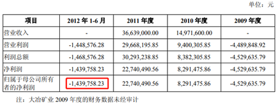我们再来看大冶矿业报表情况,在2012年收购当年1-6月,大冶矿业矿业净亏损143万(当年整体盈利1321万),2011年盈利也仅为2274万,2010年盈利仅为829万,2009年更是亏损452万。而这个标的出售给上市公司价格约为26亿。报表如下: