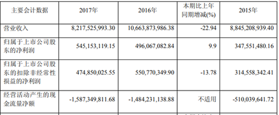 公司季度经营数据波动较大,2017 年第二季度、第三季度营业收入同比大幅下降,扣非净利润则相对变化较小,2017 年第一季度营业收入小幅下降,扣非净利润大幅下降,第四季度营业收入下降但扣非净利润却大幅增长。