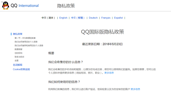 一方面,腾讯QQ国际版、新浪微博国际版反应迅速,纷纷在第一时间更新了其国际版隐私政策。