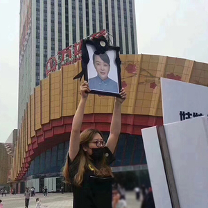 女儿雅雅举着妈妈的遗像,在南京万达茂门前讨要说法