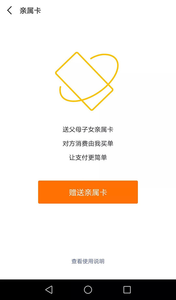 用户可通过在微信上给父母、子女开通(赠送)亲属卡,使用亲属卡消费时,消费资金将自动从代付方的支付账户扣除!