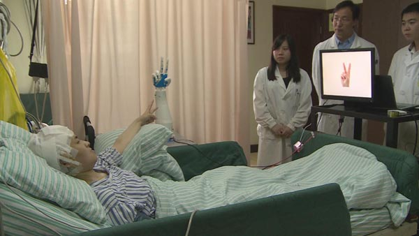 2014年,团队与浙江大学医学院附属二院神经外科合作,癫痫患者开颅切除病灶的手术过程中将一个电极阵列覆盖在大脑皮层的运动与感觉两个脑区。采集的脑电信号经计算机解读后输入到机械手,患者从而控制机械手完成了“石头、剪刀、布”的不同手势动作。