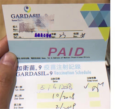 同样,来自成都的赵冰(化名)通过香港的中介,预约在香港现代医疗接种九价HPV疫苗,三针价格4800元港币,去年10月11日打了第一针,“五月初已经预约成功第二针,日期为6月11日,五月底突然发短信说不能打。”