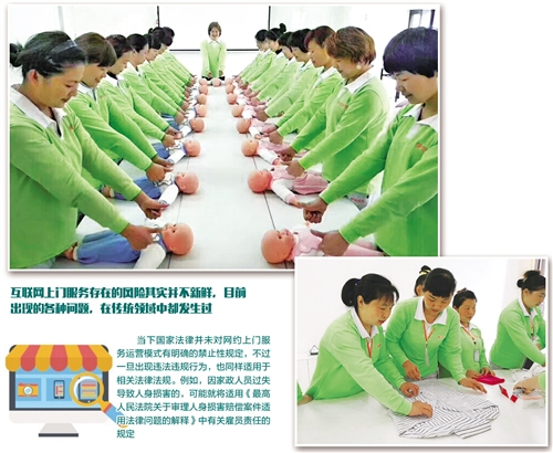 有专家表示,互联网上门服务存在的风险其实并不新鲜,目前出现的各种问题,在传统领域中都发生过。虽然当下国家法律并未对网约上门服务运营模式有明确的禁止性规定,一旦出现违法违规行为,也同样适用于相关法律法规。例如,因家政人员的过失导致人身损害的,可能就将适用《最高人民法院关于审理人身损害赔偿案件适用法律问题的解释》中有关雇员责任的规定。
