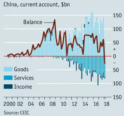 从中国经常账户盈余/GDP比重,中国在2007年达到了10%,随后快速下降,2017年已经回落到了1.3%,创下了18年来新低水平。