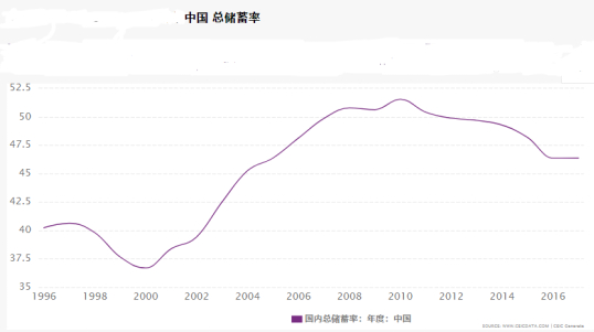 从上图的中国总储蓄率来看,从2000年开始,中国总储蓄率一路攀升,到了2010年的最高点51.5%。随后快速回落,到2017年底46.4%。