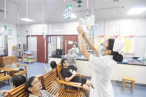 在民族医院输液室,护士正在忙碌工作