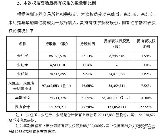 早在5月30日,红宇新材便宣布股东朱红玉、朱明楚、朱红专拟分步转让合计所持红宇新材股份8830万股(股份比例20%)给华融国信,其中此次转让2421万股,于2021年2月5日前分步转让剩余6409万股;另外拟将后续分步转让的6409万股所涉及的表决权、提案权等相应股东权利委托给华融国信。