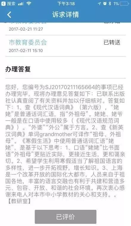 有网友找出了去年上海市教委针对这一问题的答复,上海教委认为,“姥姥”是普通话语词汇,而“外婆、外公”属于方言。