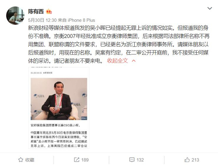 不过吴小晖案件还未结束。5月30日,多家媒体报道称,浙江京衡律师事务所律师陈有西5月30日在其社交媒体披露,吴小晖不服一审两罪判决,已经提起无罪上诉;上海市高级人民法院已组成二审合议庭。
