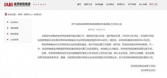 5月28日,安邦保险集团接管工作组在安邦保险集团官网发布公告称,安邦保险集团战略股东遴选工作已经启动,并按计划稳步推进。公告还称,安邦没有出清海外资产的计划,对资产优化工作也没有明确的时间表。